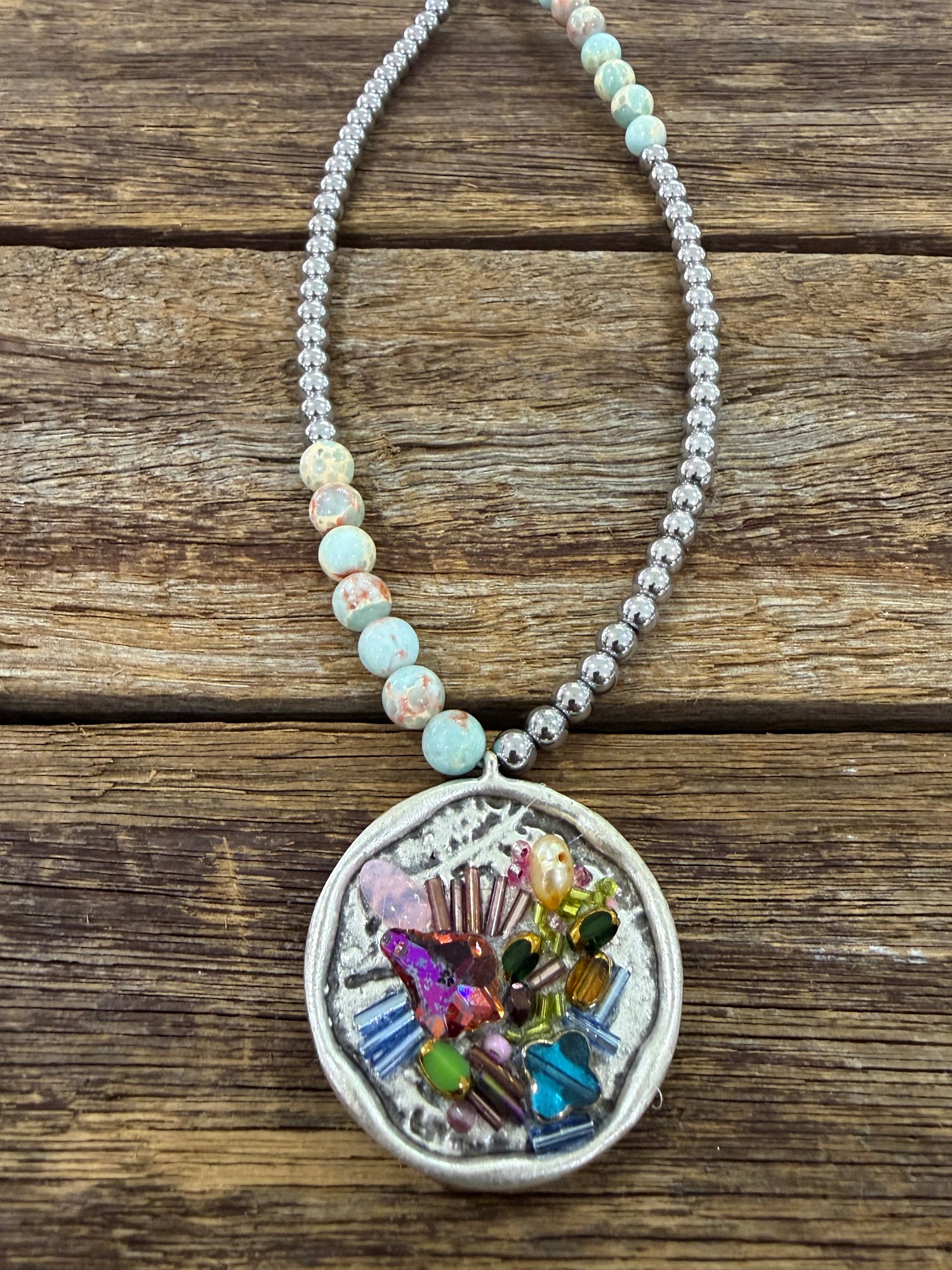 Handmade Hematite and Amalgonite necklace embellished with a cluster of Swarovski crystal art . 51 cm in length