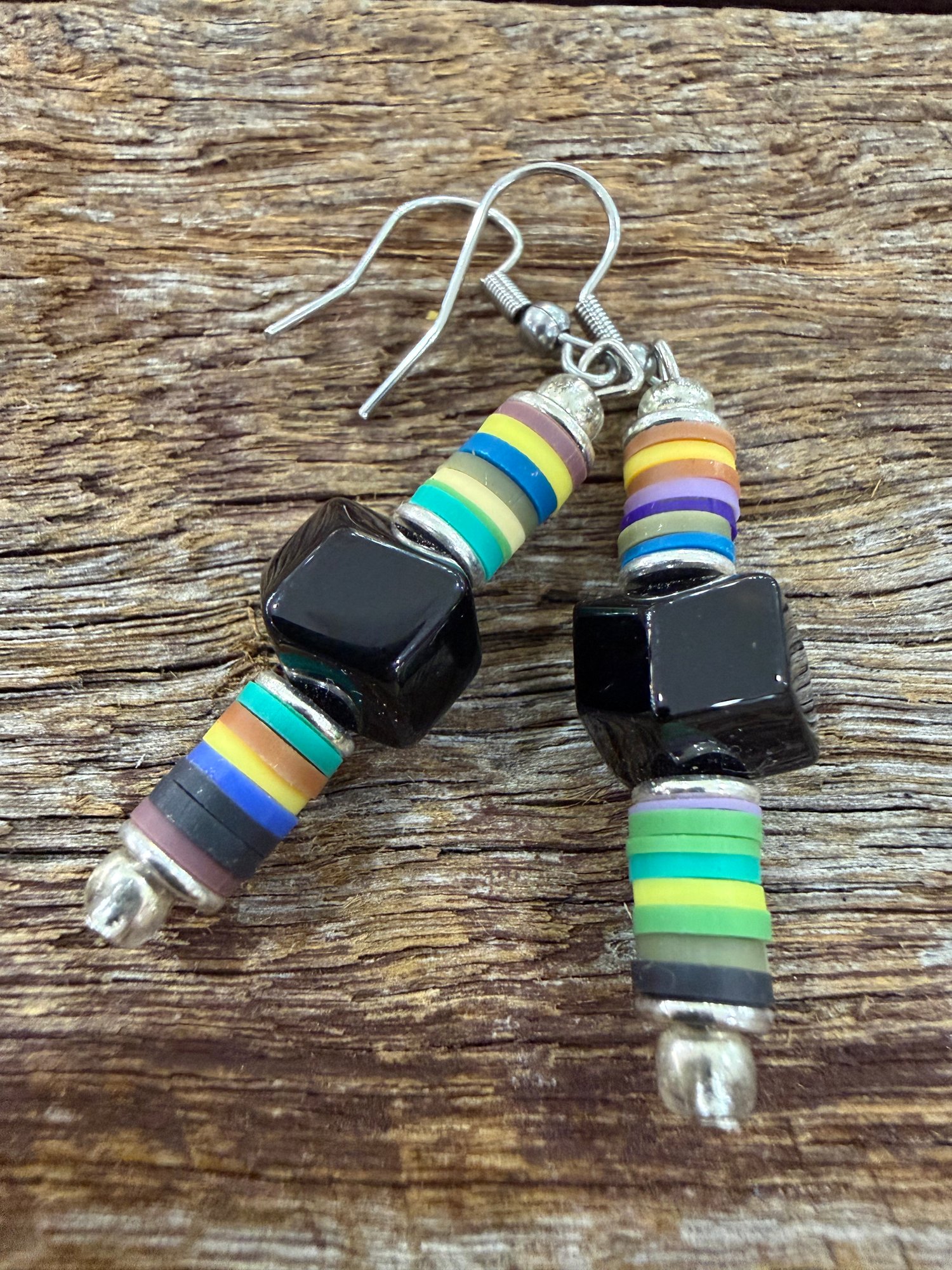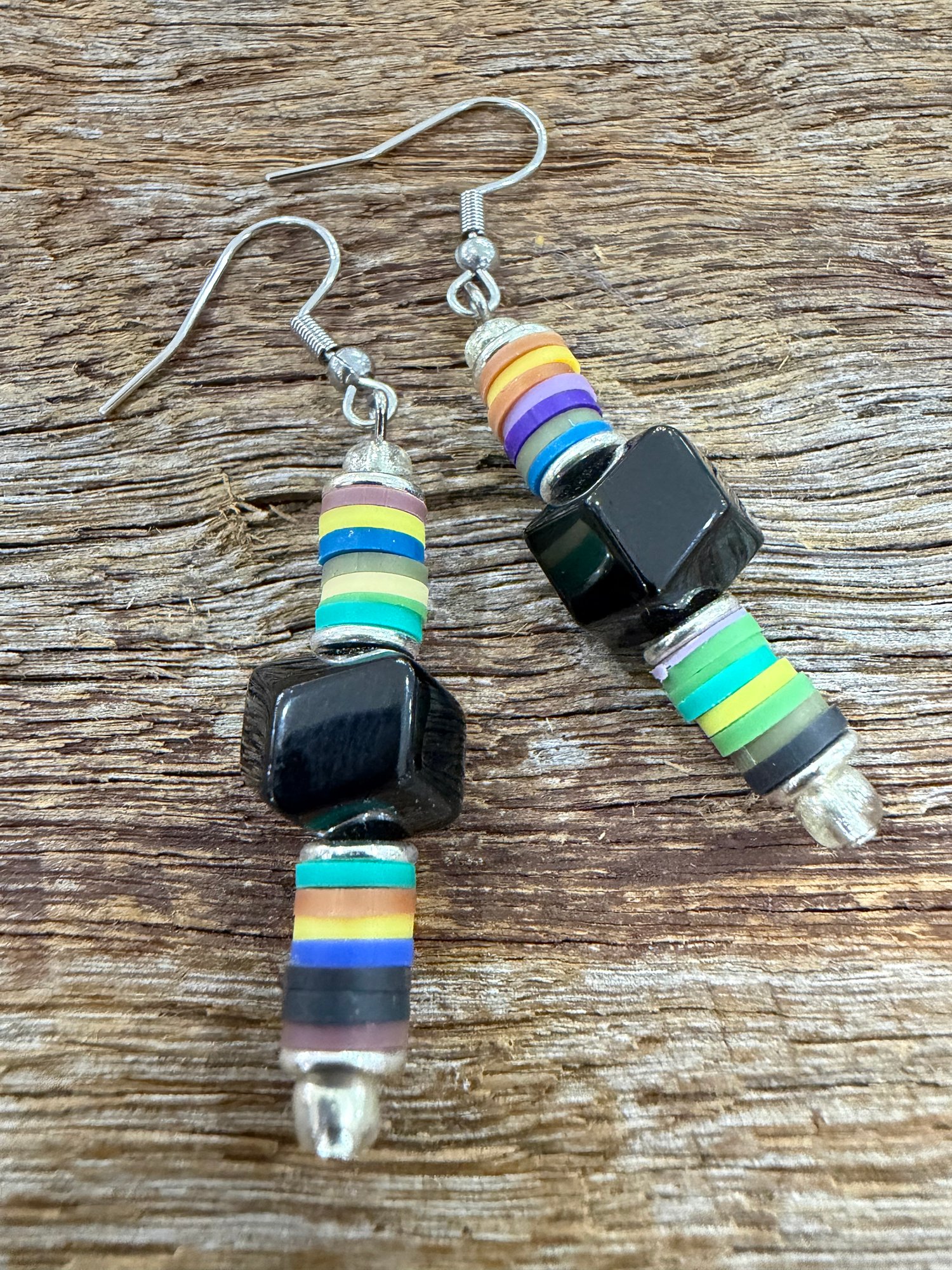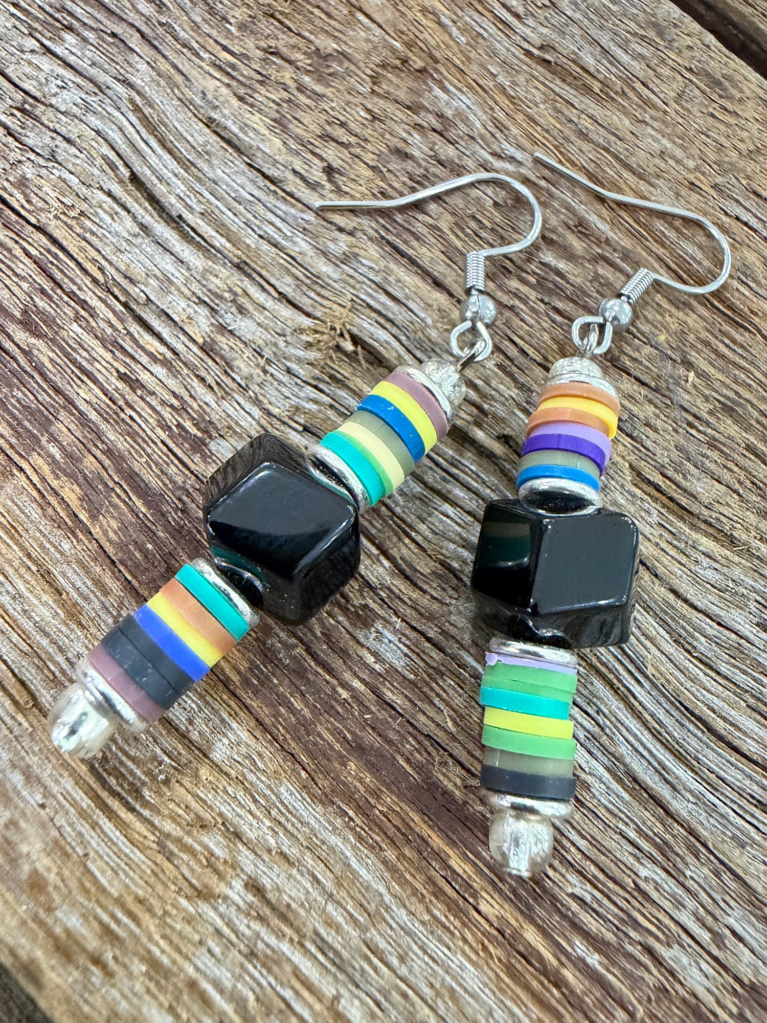 Artistic Black onyx earrings, handmade with lightweight Lazer cut resin coloured discs. Surgical steel hooks . 3cm length