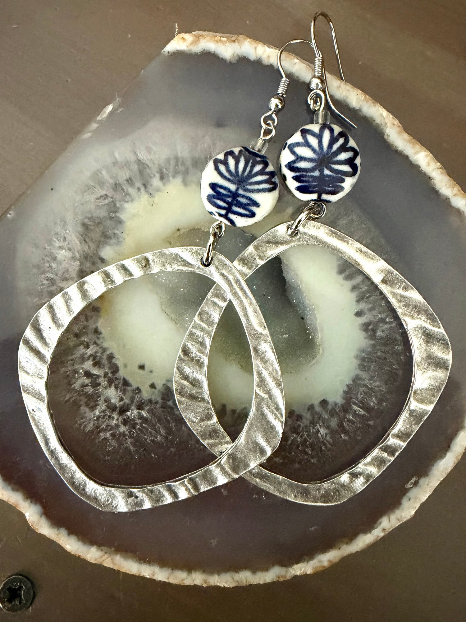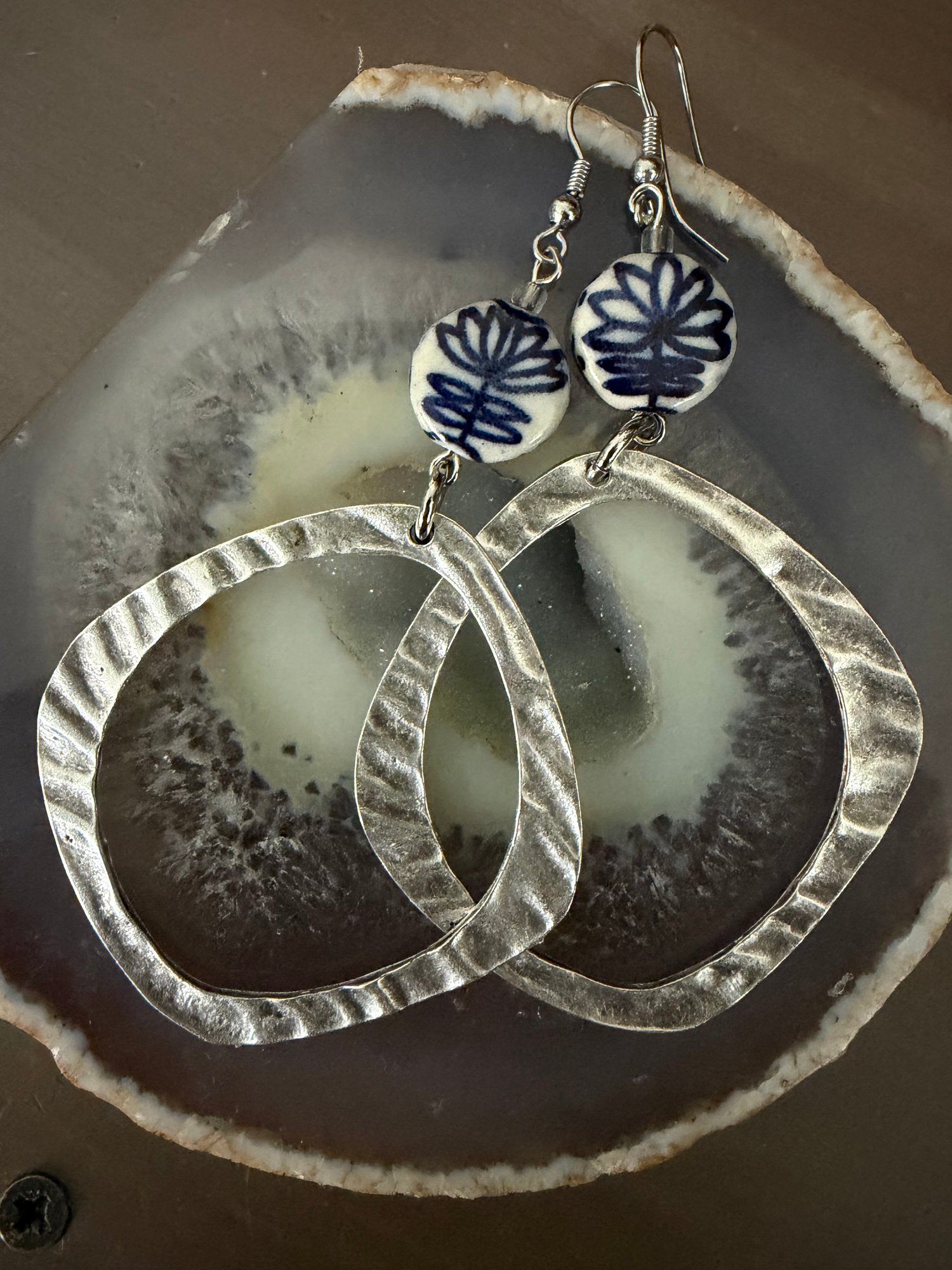 Oxidised Silver earring’s with beautiful ceramic Delph beads . Surgical steel hooks 6.5 cm length