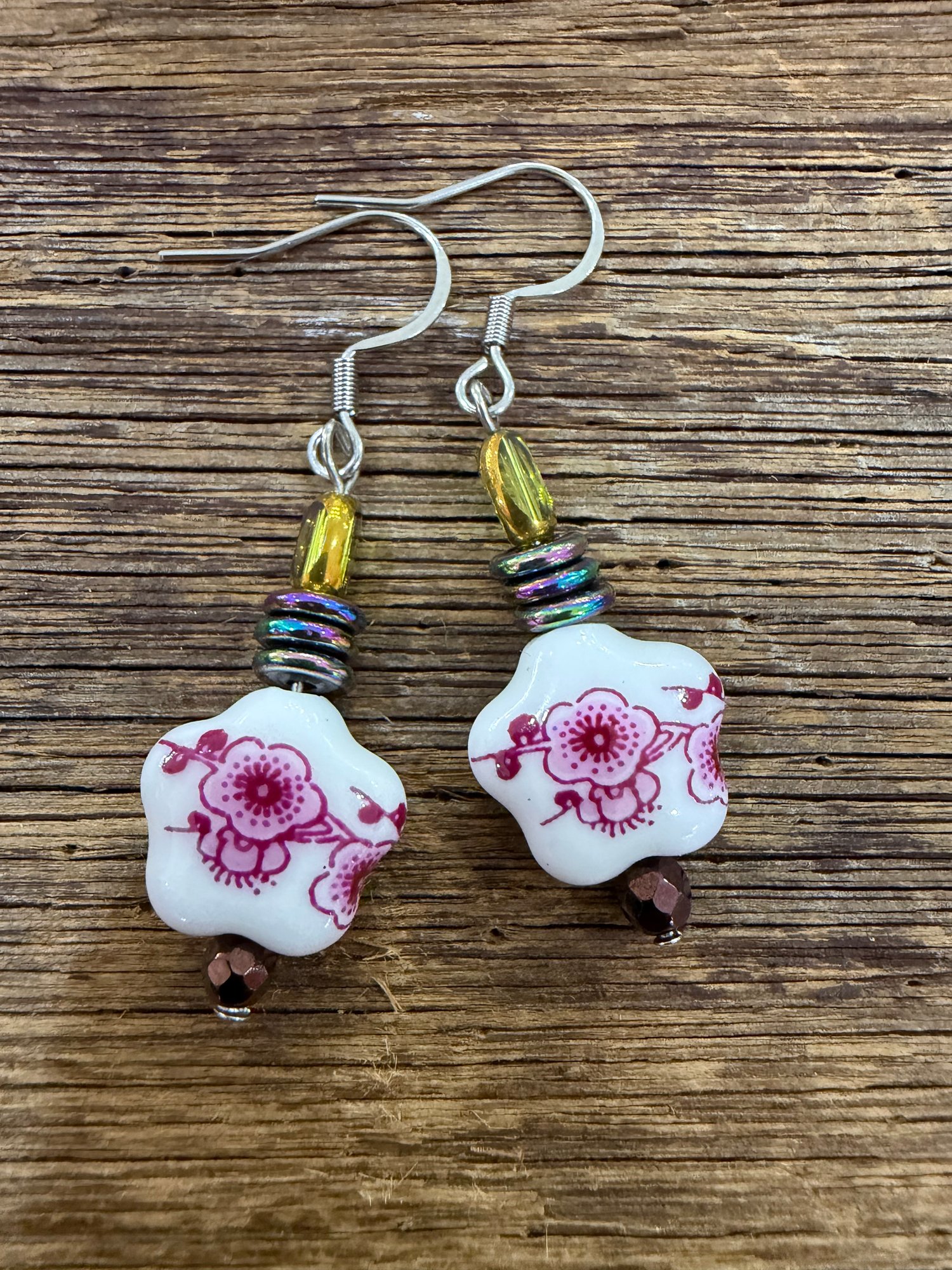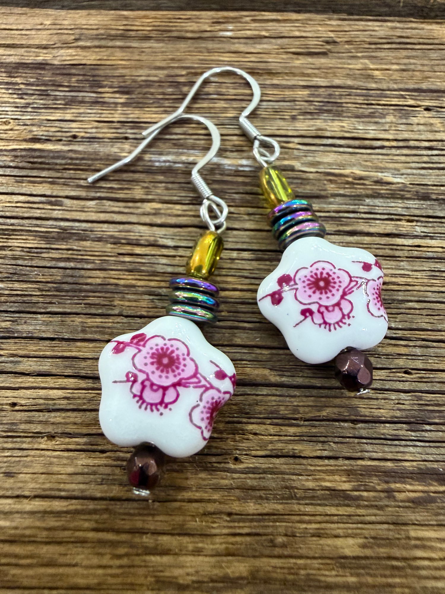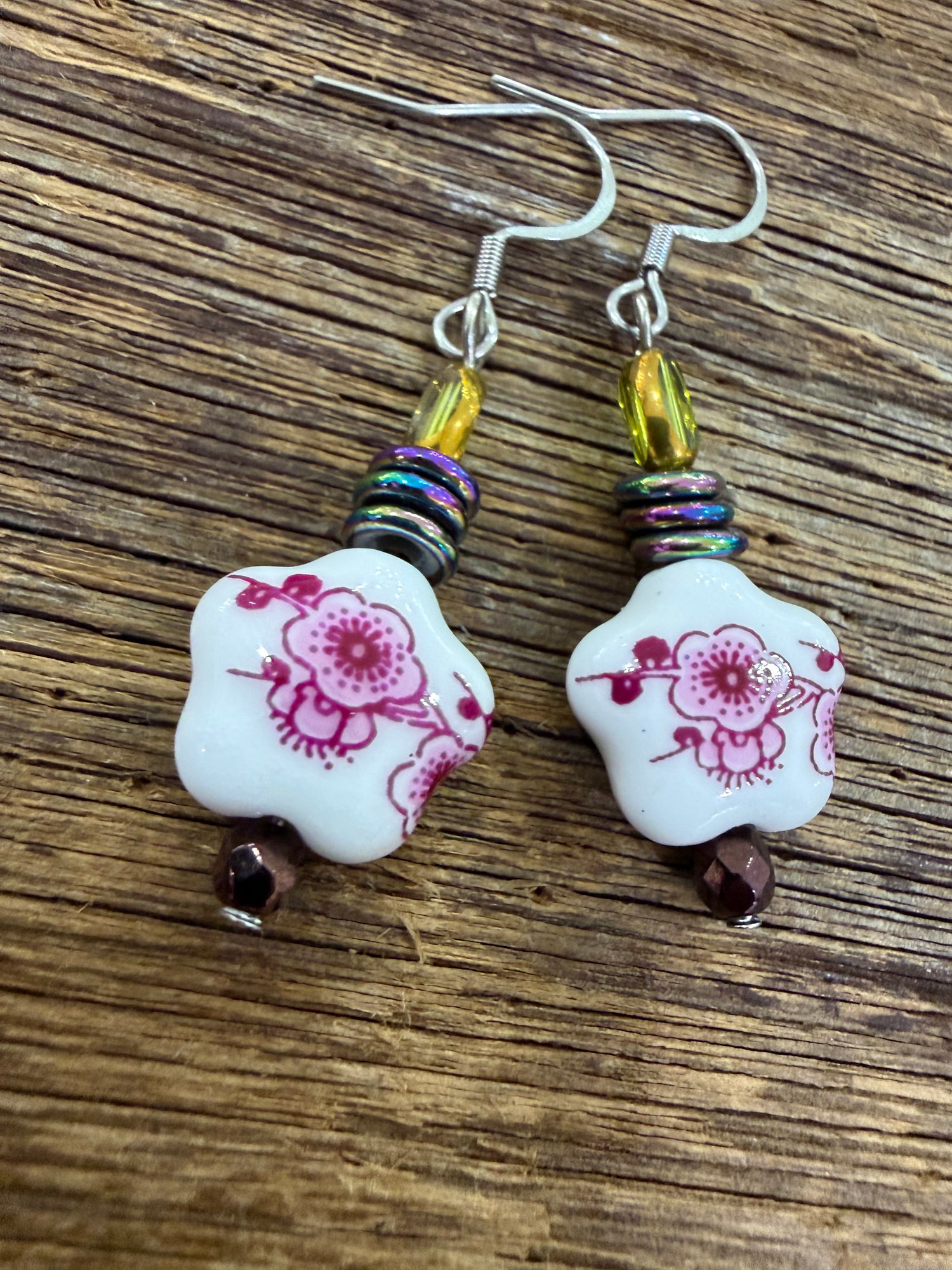 Lightweight floral Delph earrings with colorful hemantite crystals . Surgical steel hooks, 2cm drop.