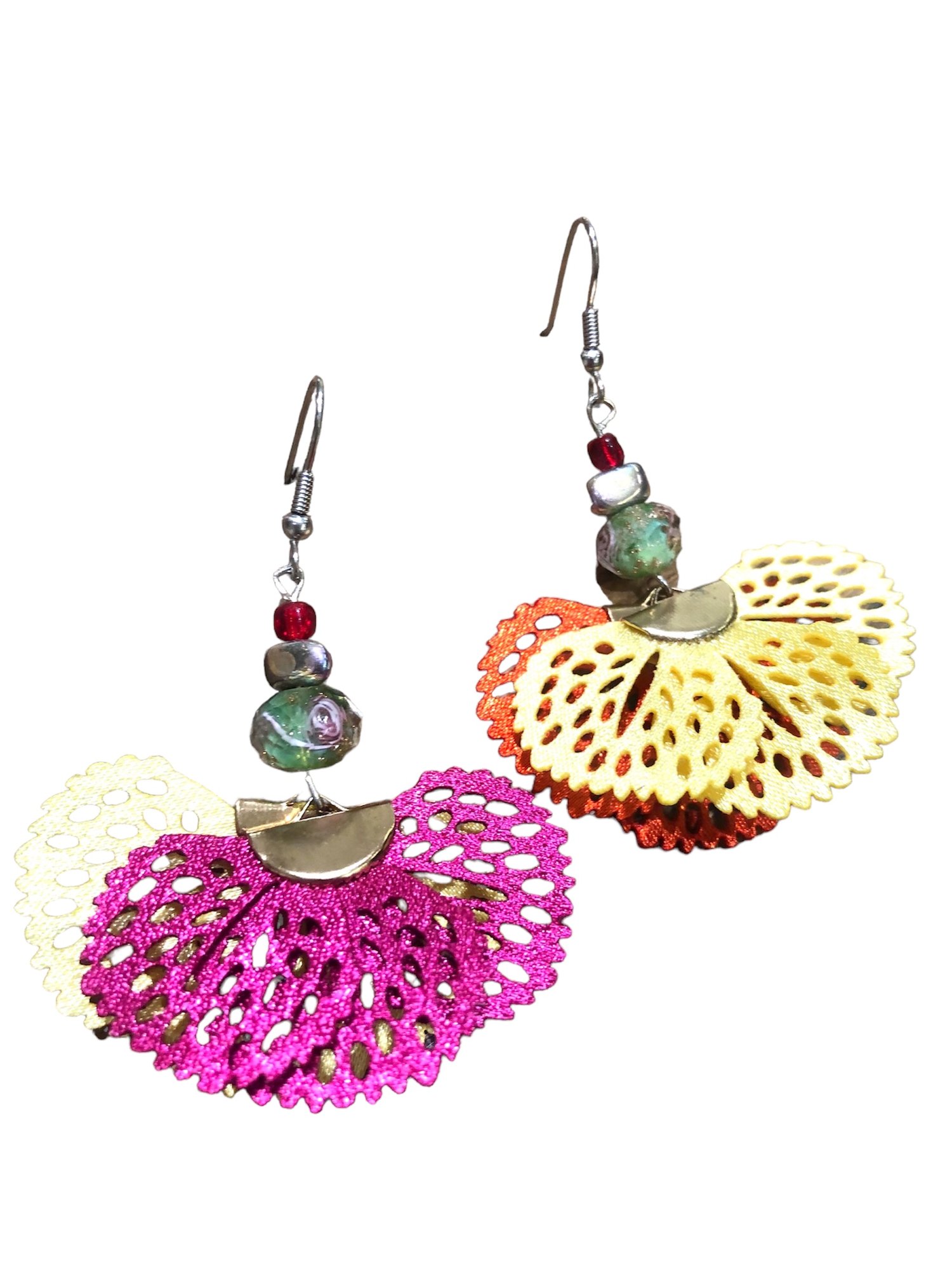 Handmade stencil cut earrings with unique fabric material. Lovely floral glass marano style beads and hemantite gemstones make these little stunning jewels the perfect statement piece.Surgical steel hooks. 5.5cm length.