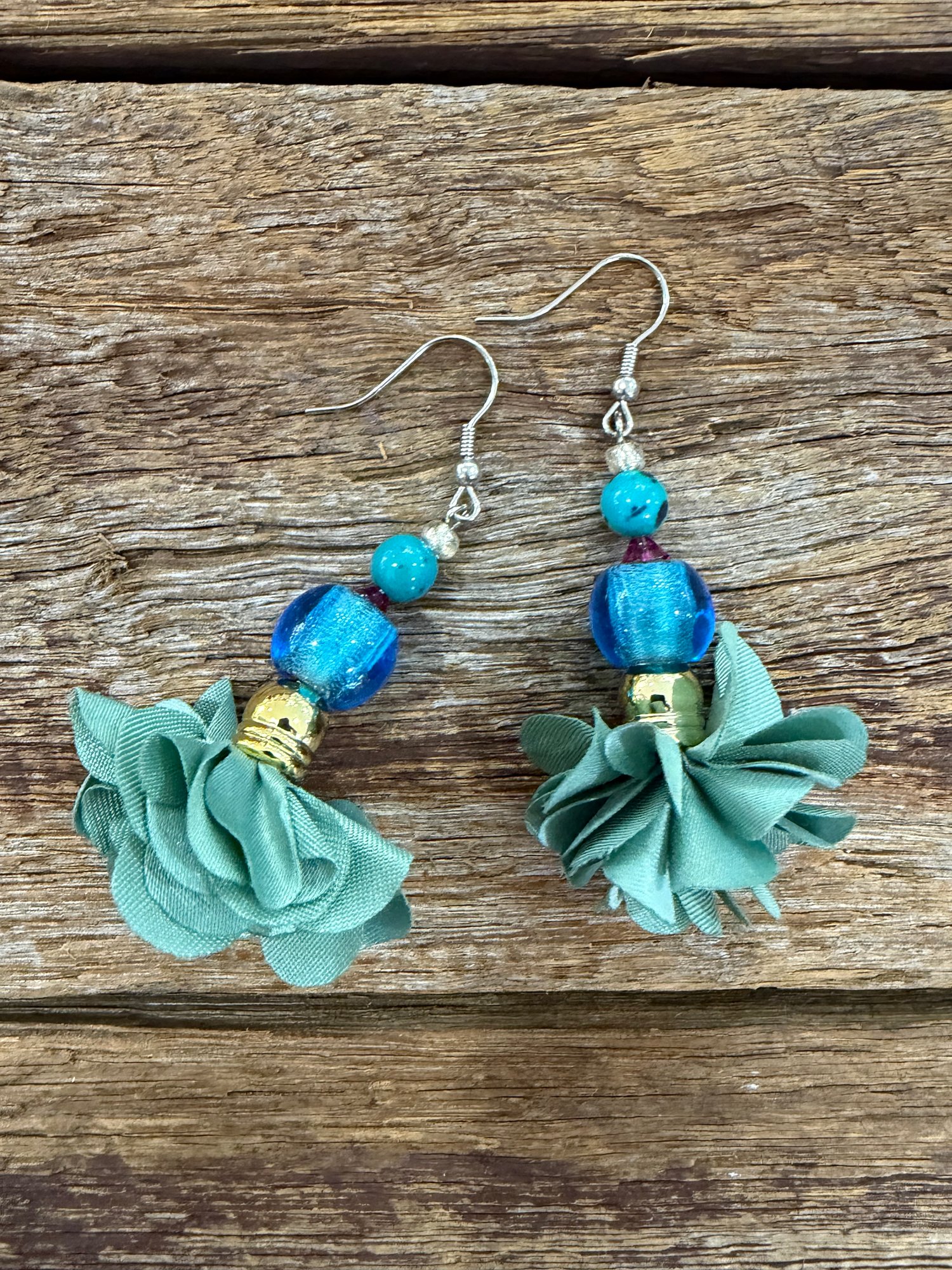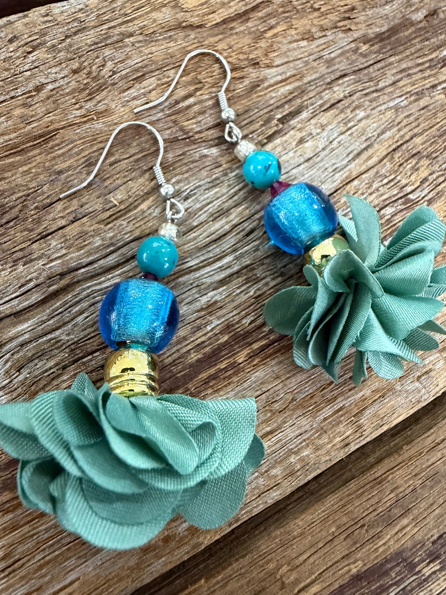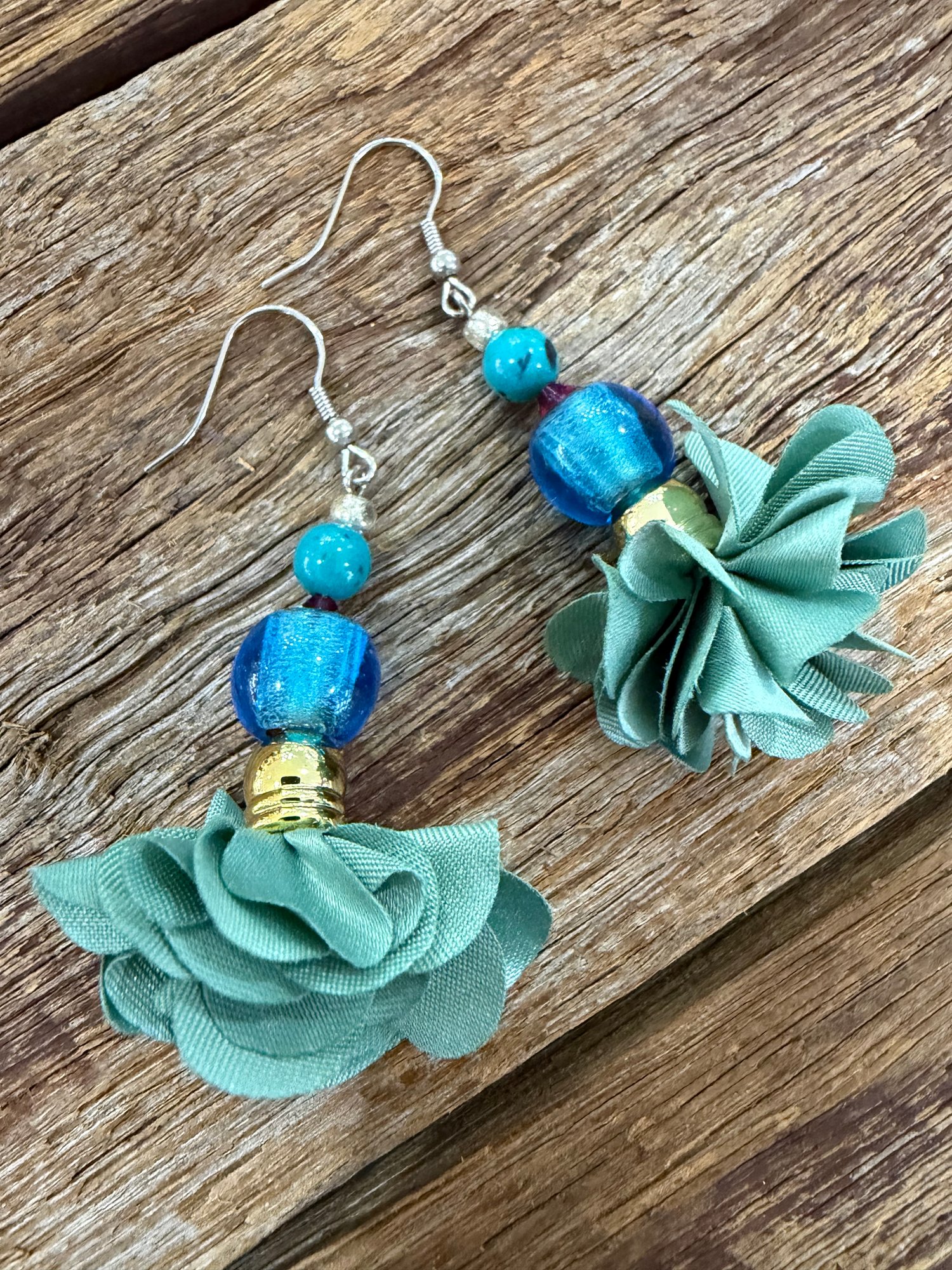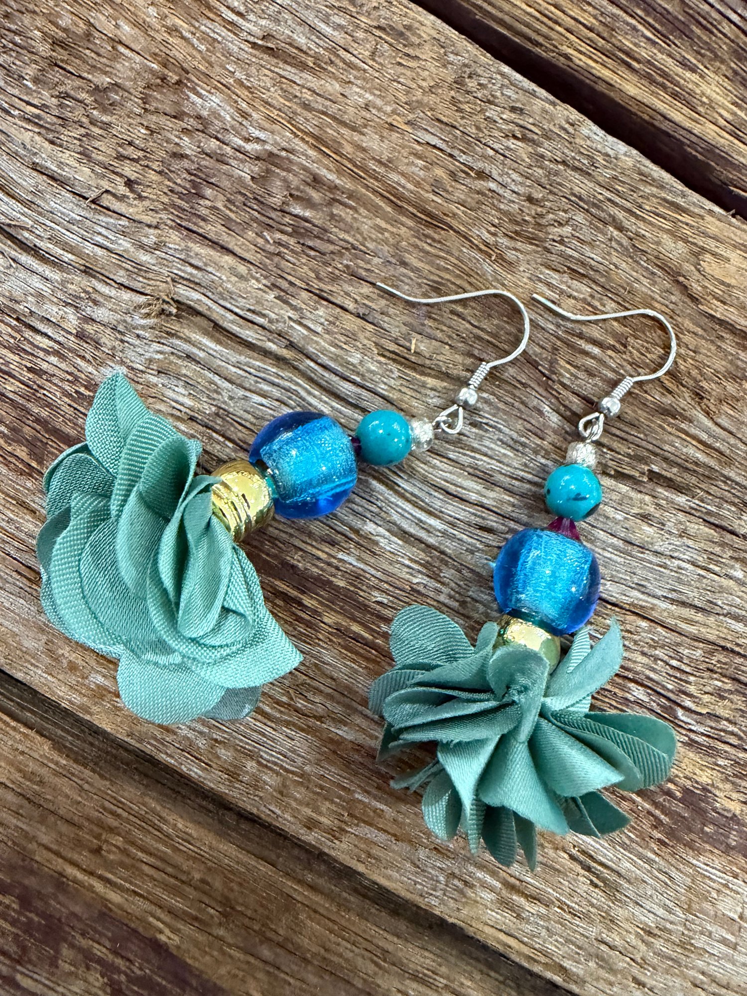 Handmade stencil cut earrings with unique fabric material. Lovely floral glass marano style beads and gemstones make these little stunning jewels the perfect statement piece.Surgical steel hooks. 5.5cm length.