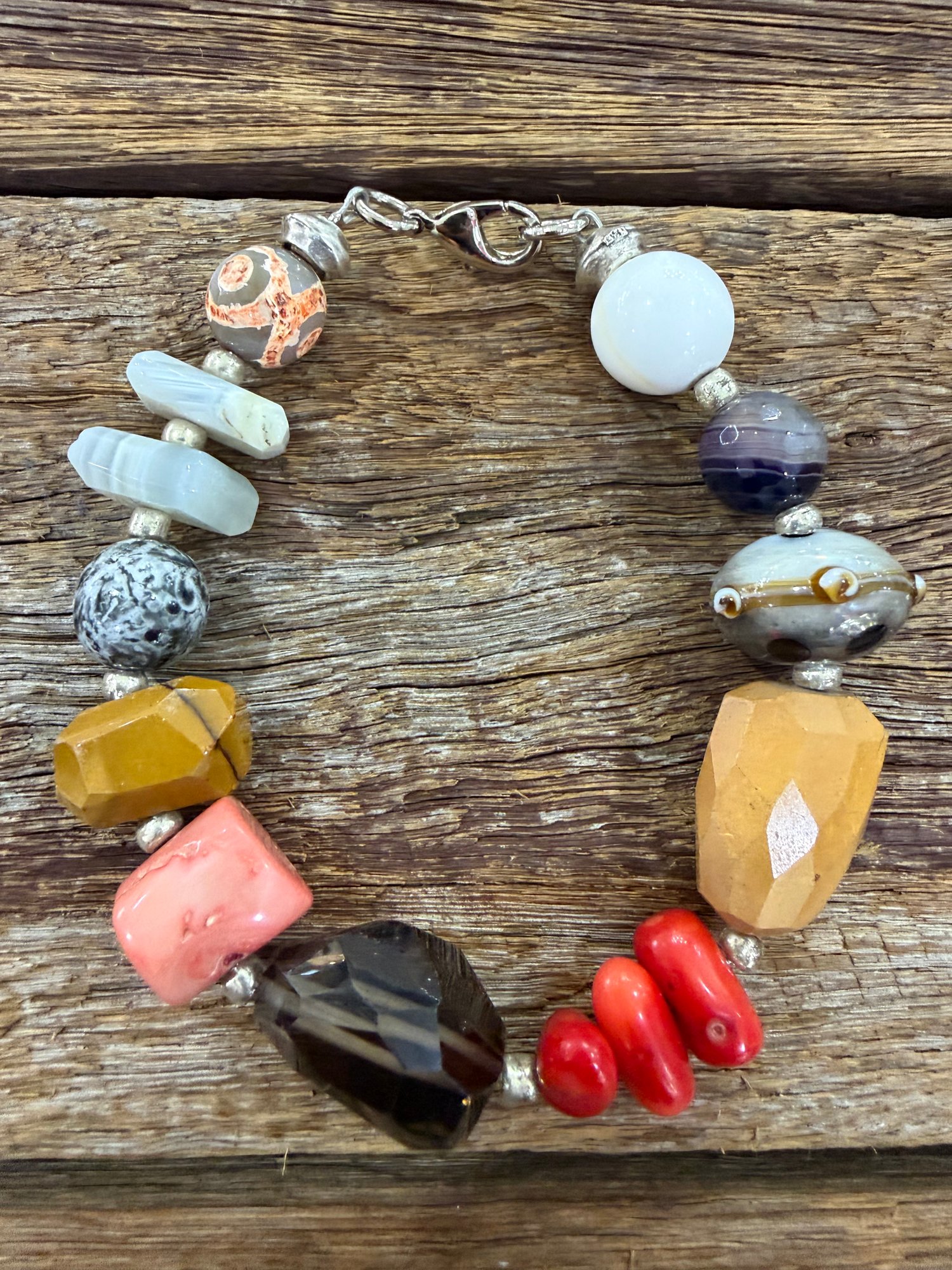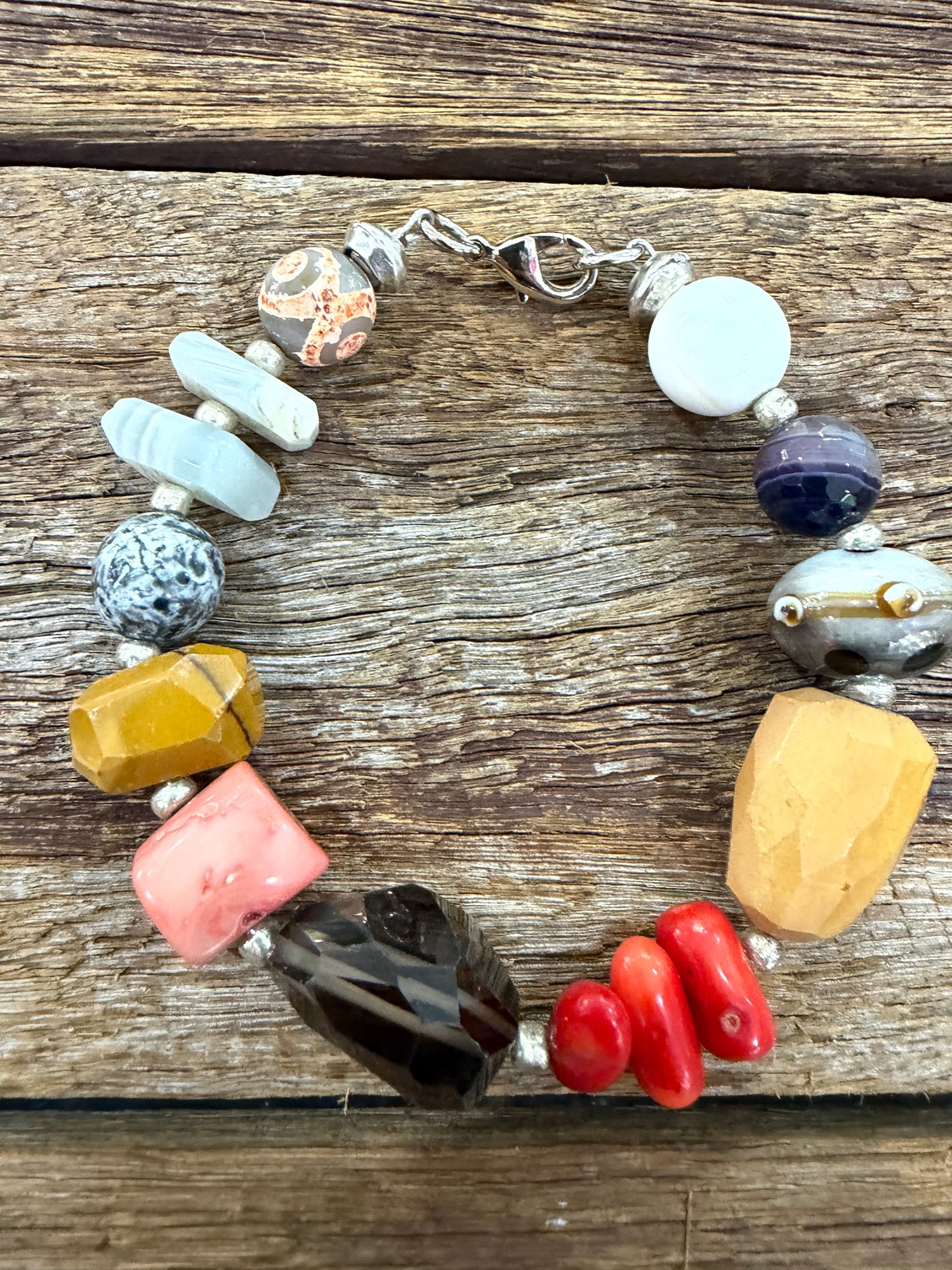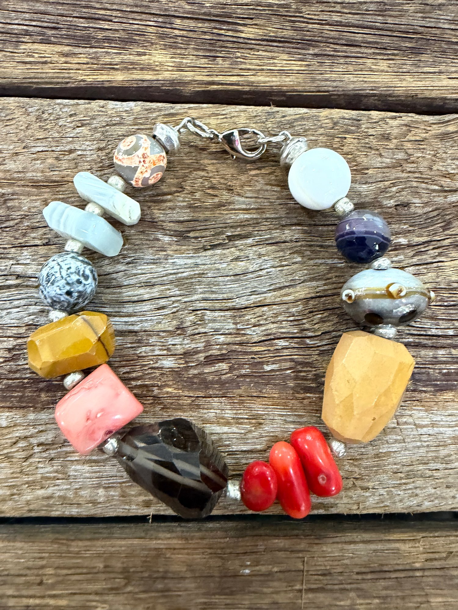 Combination gemstone bracelet, Quartz,Coral,Agate and Marano Glass beads . Sizing is large wrist