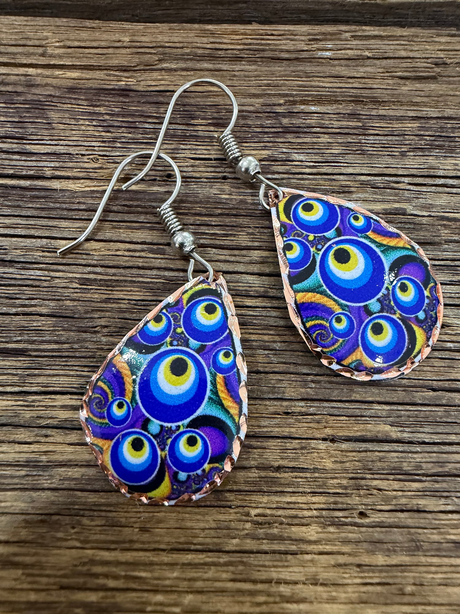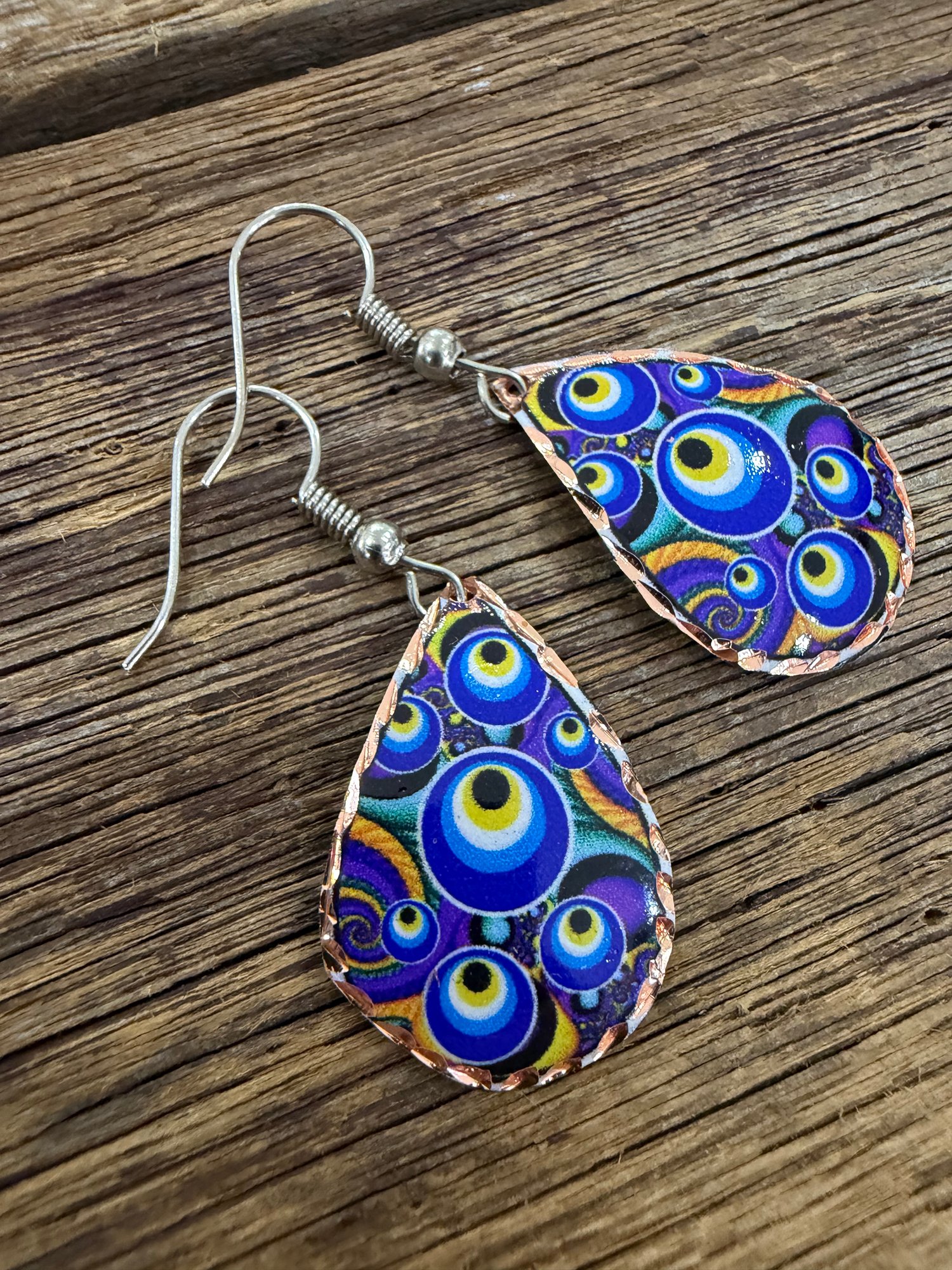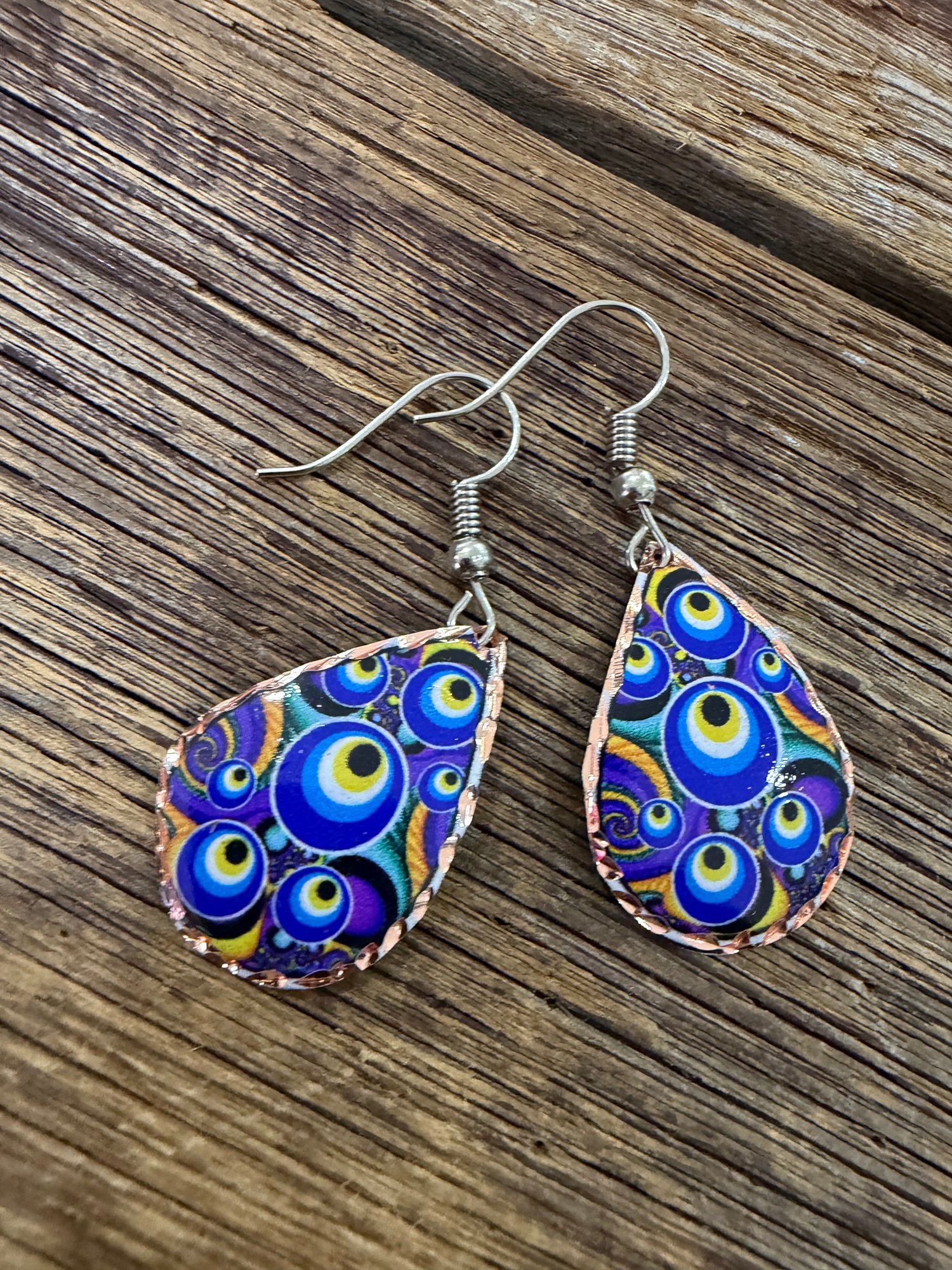 Lightweight Turkish copper earrings , hand painted , Lazer engraved and enameled to seal the gorgeous artwork. 3cm drop