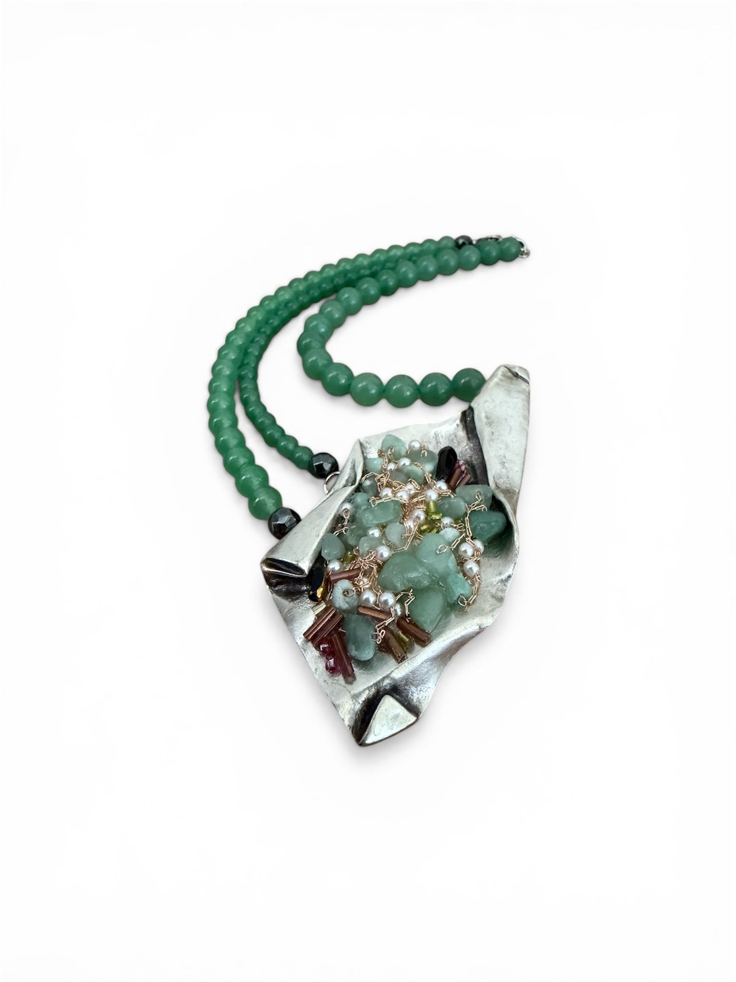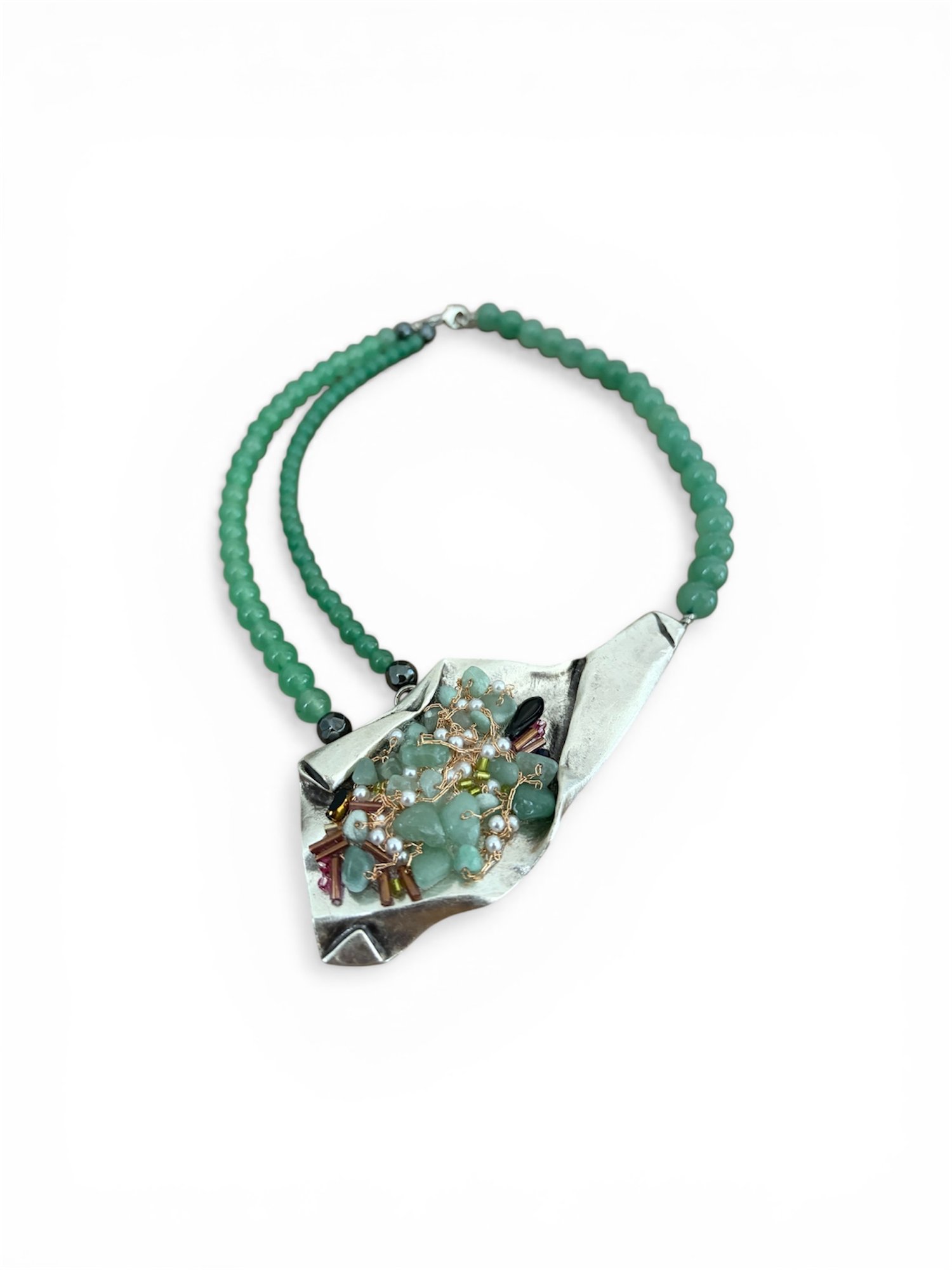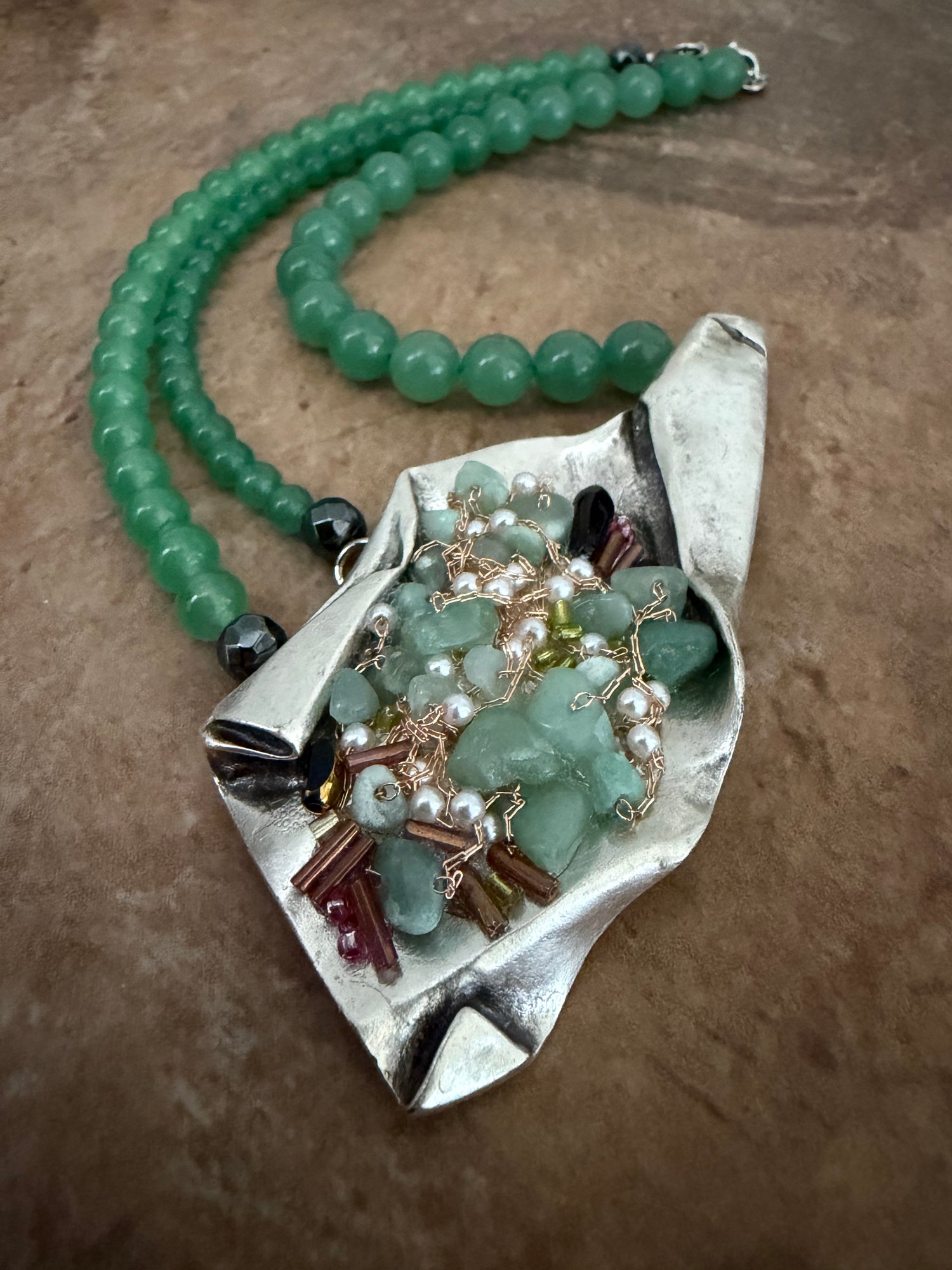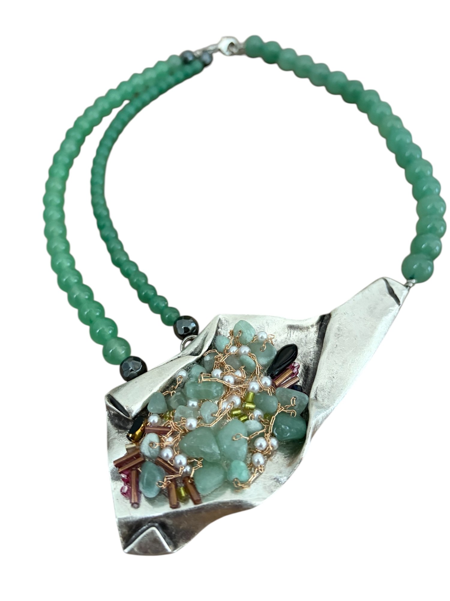 Beautiful Aventurine beaded gemstone necklace with a magnificent grand Ottoman silver pendant embellished with Aventurine and pearl gems . A stunning one off hand made piece for all occasions.