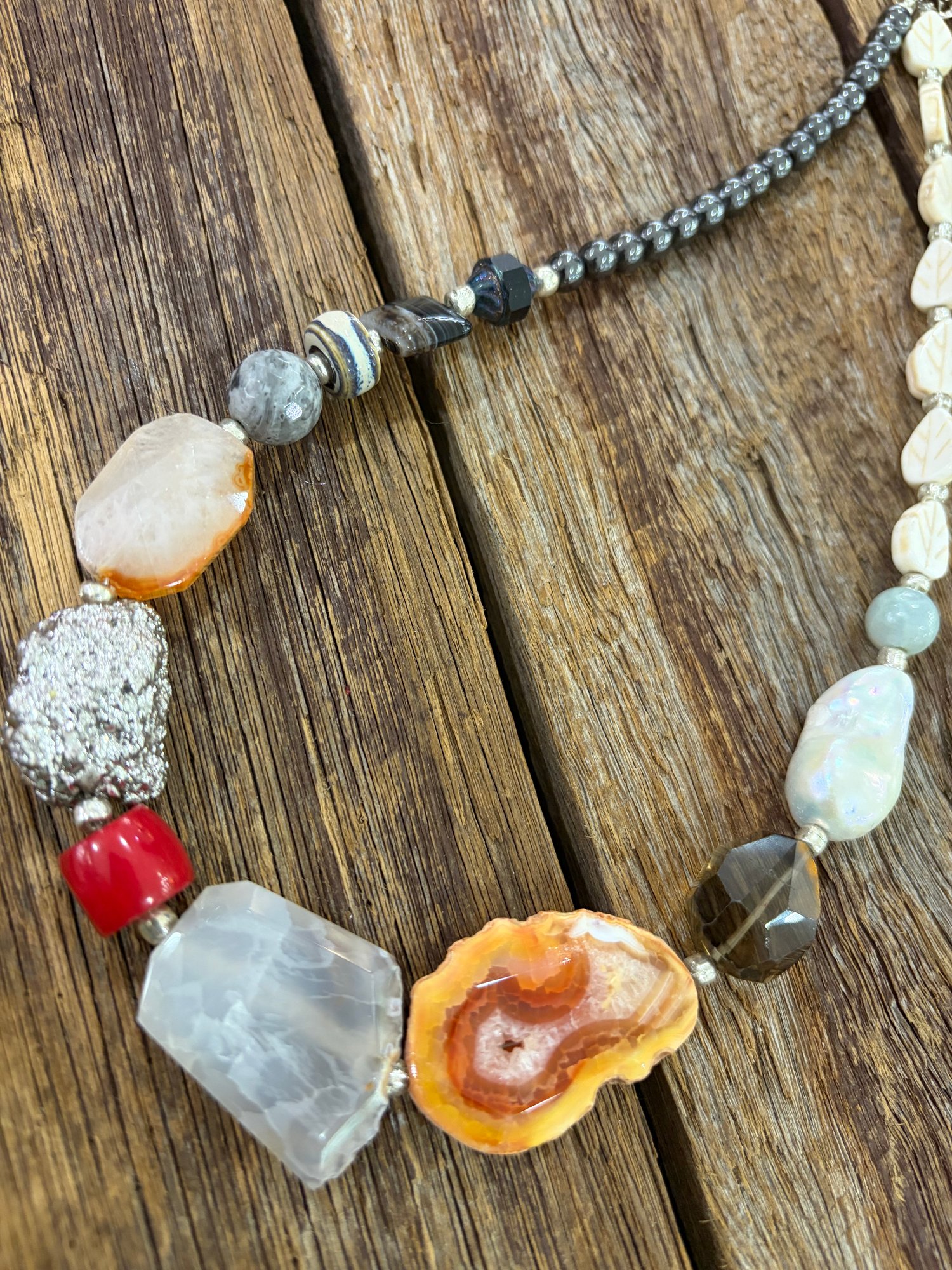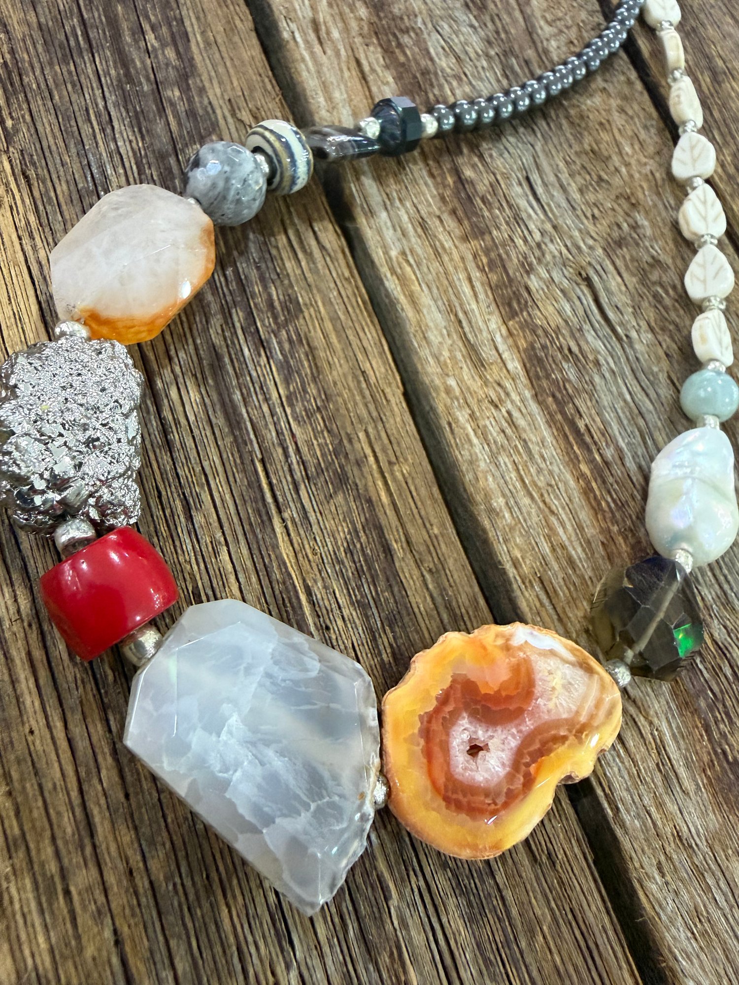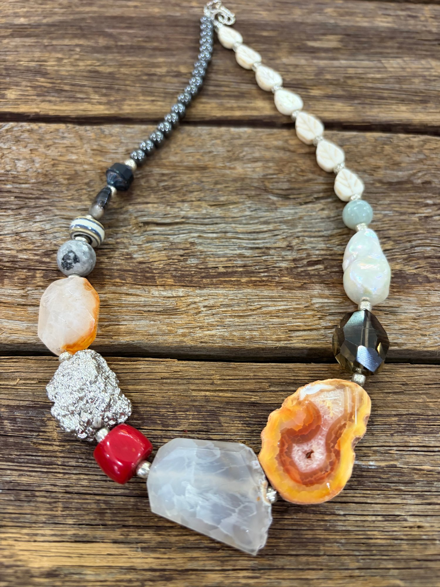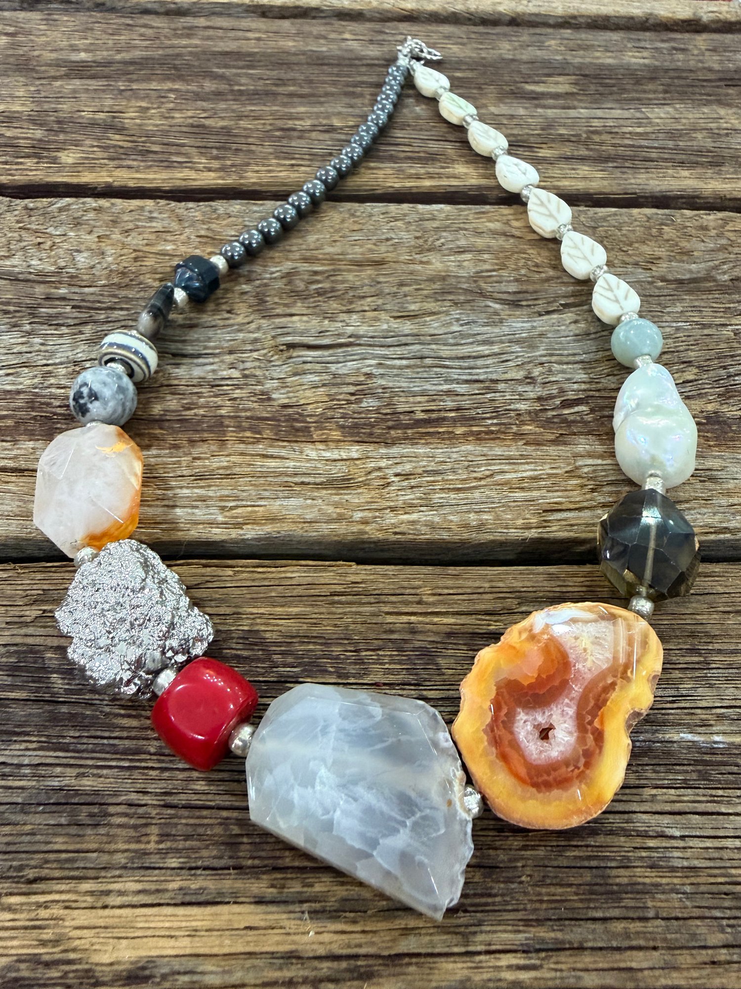 Unique handmade necklace with an assortment of colourful gemstones ranging from Fresh water Pearl, Hematite, Pyrite, Quartz, Coral and Howlite. One size fits all.