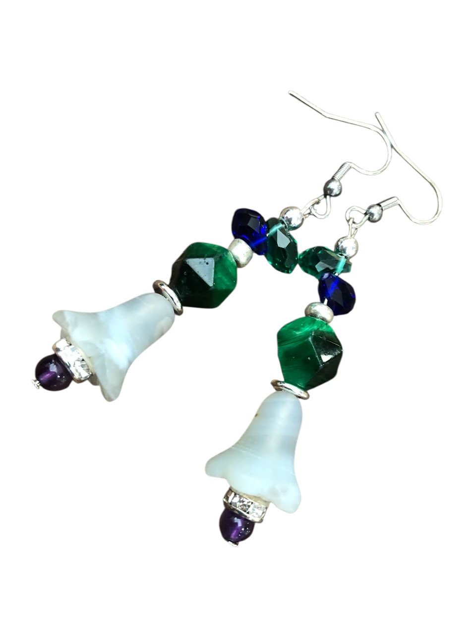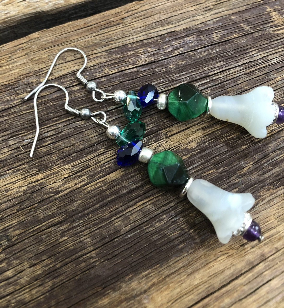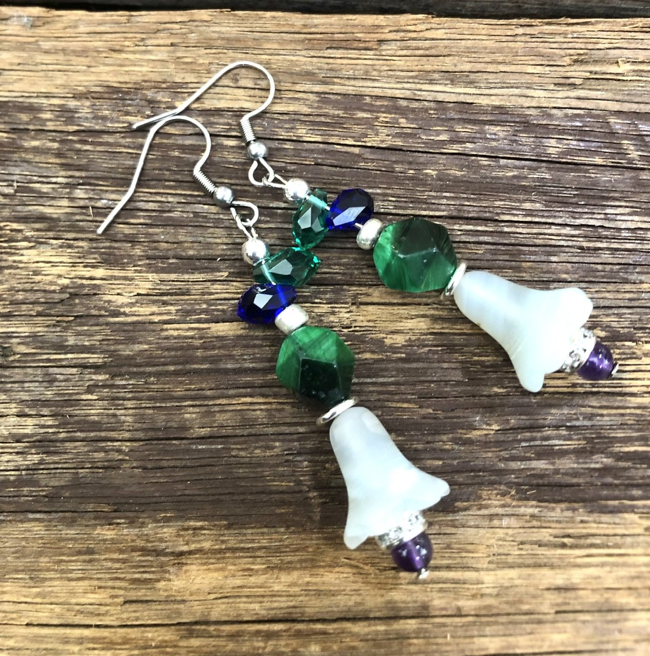 Hand carved quarts gemstone earrings with Amethyst and crystals. 5cm drop in length. Surgical steel hooks.