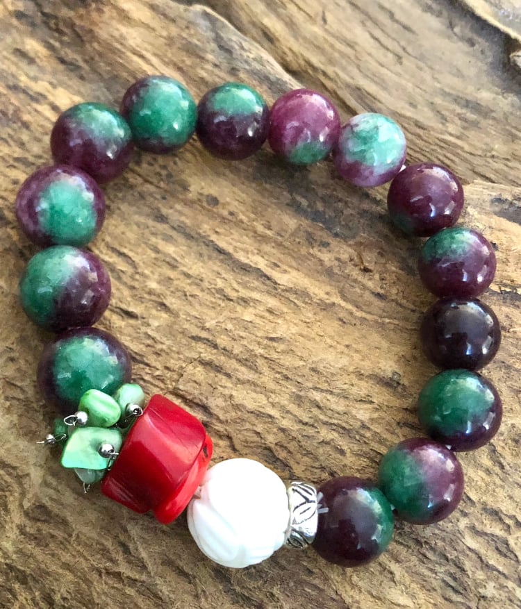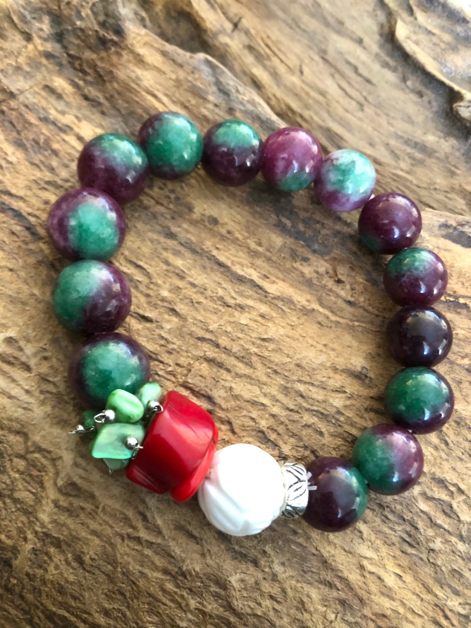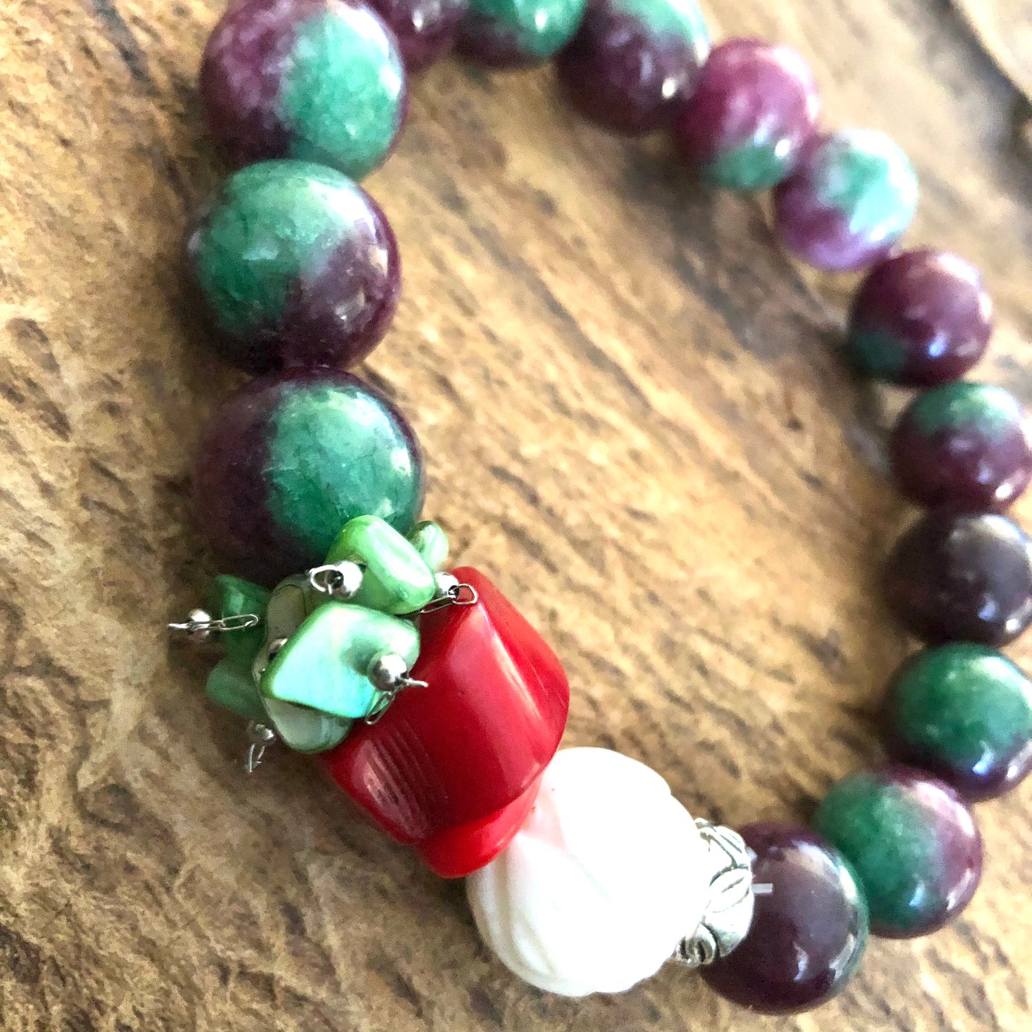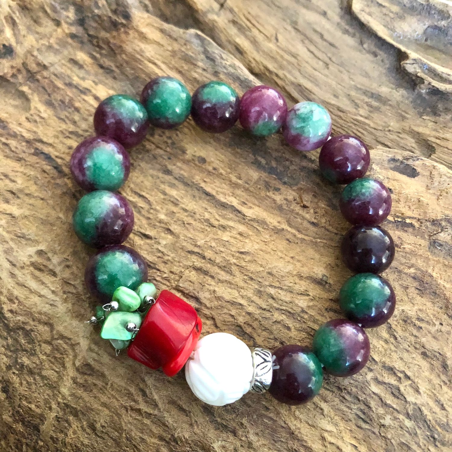 Malaysian Jade gemstones with a cluster of mother of Pearl Coral and Howlite. Medium to large size