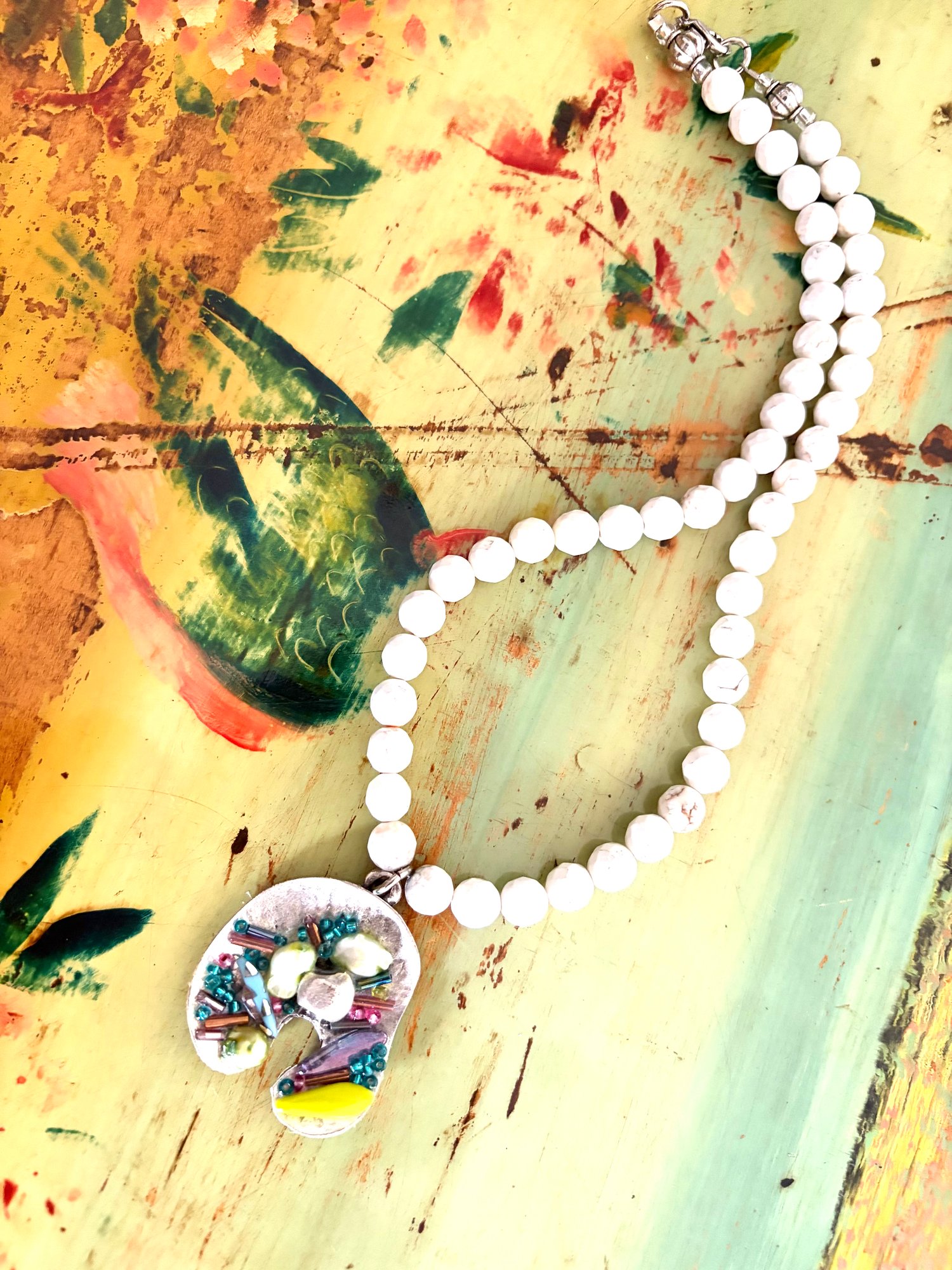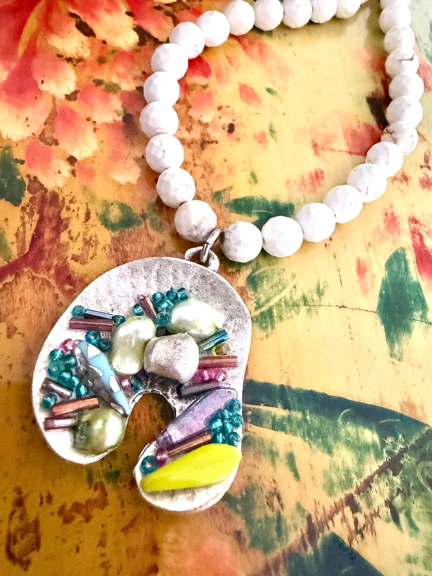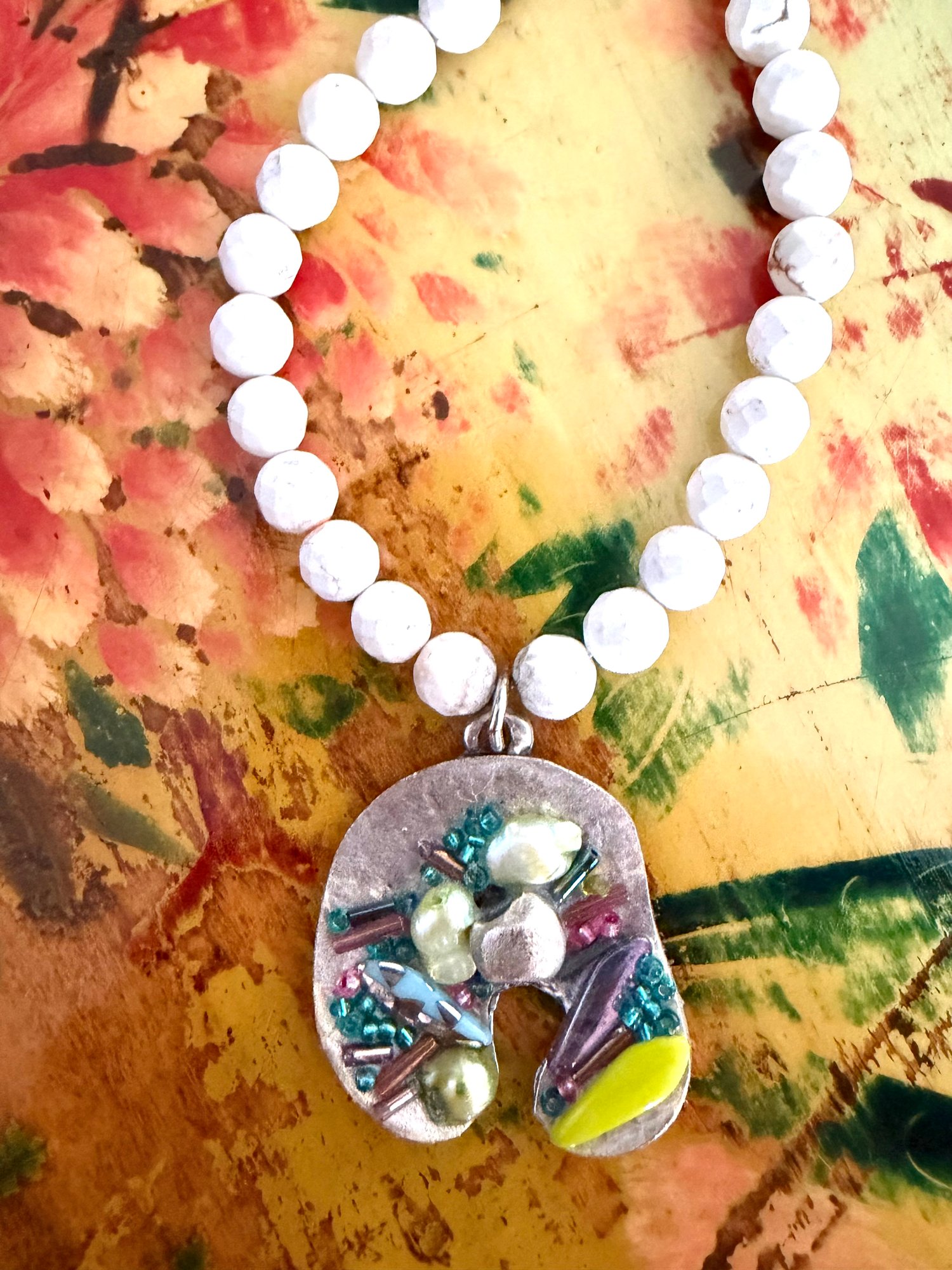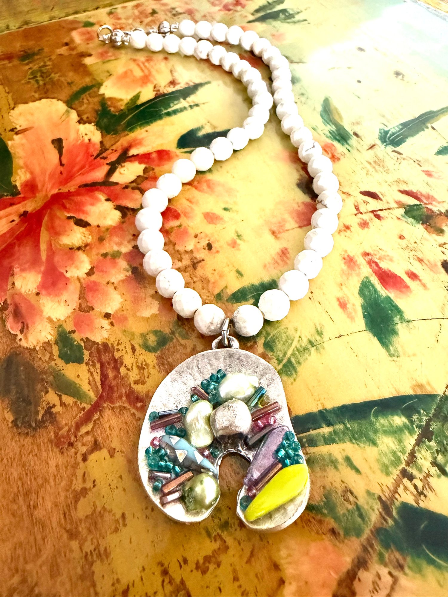 An elegant handcrafted necklace that can be worn with a vast range of colours. A great seasonal piece with its lovely artistry. White faceted Howlite gemstones and green pearls .