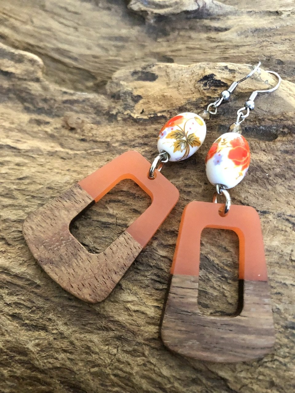 Resin and wood with hand painted ceramic beads make up a very beautiful lightweight pair of earrings. 5cm drop in length.